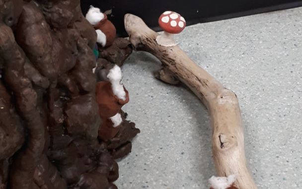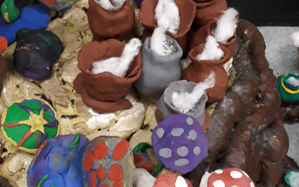 We used the tree stump props from the drama studio as bases for the mushrooms. The students made extra bright and beautiful mushrooms for fun to add to the display.